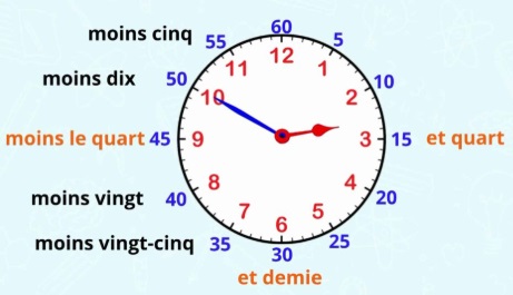 Обозначение суточного времени на французский лад - L'heure en françaisВо французской системе существуют два способа обозначения времени суток - это обиходный и официальный, и оба используются повседневно. Обиходный вариант (l'heure courante) используется в основном в устной речи - это 12-часовой формат исчисления времени, суточное время делится на два 12-часовых интервала — пополуночи и пополудни. Соответственно, 12h00 — это "midi" полдень, а 00h00 — называют "minuit" полночь, сутки — vingt-quatre heures.После полудня (пополудни) — устойчивая языковая форма, обозначающая время суток, следующее после двенадцати часов дня и предшествующее вечеру - «вторая половина дня». Для обозначения времени по-французски используется безличный оборот: Il est … heures, затем просто прибавляется количество часов. Сокращённо, текущее время можно обозначить цифрами так: 06 h 15 - 06:15. Чтобы различать ночное и дневное время, используют выражения: « du matin » - утро, midi - полдень, « de l'après-midi » после полудня, « du soir » вечер, « minuit » - полночь.Для указания промежутков времени используются также меры: et quart - четверть; et demi - половина; moins le quart - без четверти; moins dix - без десяти; moins cinq - без пяти. Пример: 4 h 15 - il est quatre heures et quart 4 h 30 - il est quatre heures et demi 4 h 45 - il est cinq heures moins le quart 4 h 50 - il est cinq heures moins dix 4 h 55 - il est cinq heures moins cinq В русской системе называют не текущий час, а последующий, потому что он уже начался, и как видите наша система обозначения времени суток отличается, у французов нет понятий: пятый час, начало первого, три часа ночи — после полуночи начинается утро "du matin": à une heure du matin - дословно «в час утра». К счастью, есть общее понимание секунд и минут. Выражение « du matin » имеет несколько значений: 1. последующие часы после полуночи, без намёка на тёмное или светлое время суток. 2. утренние светлые часы начала дня, пробуждения, до полудня. Выражения "le soir" и "du matin" используются для обозначения промежутков времени, протекающих до отхода ко сну и после пробуждения. Сравните: 1. до отхода ко сну/перед сном - avant d'aller se coucher:J'ai pris une douche à 3 heures hier soir. Я принял душ в 3 часа ночи, вчера. Je me suis couché à 3 heures du matin hier soir. Вчера я лег спать в 3 часа ночи. Je ne me suis pas couché avant 3 heures du matin hier soir. Я не мог заснуть до 3 часов ночи. 2. после пробуждения - après avoir se lever:J'ai pris une douche à 3 heures ce matin. Я принял душ в 3 часа ночи. Je me suis réveillé à 3 heures du matin. Я проснулся в 3 часа ночи. J'ai été déjà debout à 3 heures du matin. Я встал аж в 3 часа ночи. Официальный вариант (l'heure officielle) — это 24-часовой формат исчисления времени, используется в основном в письменной форме в административных органах и государственных учреждениях, там, где двусмысленность 12-часового формата считается слишком неудобной или затруднительной. Сутки делятся на 24 часа и длятся от полуночи до полуночи.16 h 15 - Il est seize heures quinze 16 h 30 - Il est seize heures trente 16 h 45 - Il est seize heures quarante-cinq 16 h 55 - Il est seize heures cinquante-cinq Обратите внимание, обиходный и официальный - это 2 разных несовместимых способа обозначения времени суток, не путайте их при указании послеполуденного или вечернего времени. Например, неправильно указывать